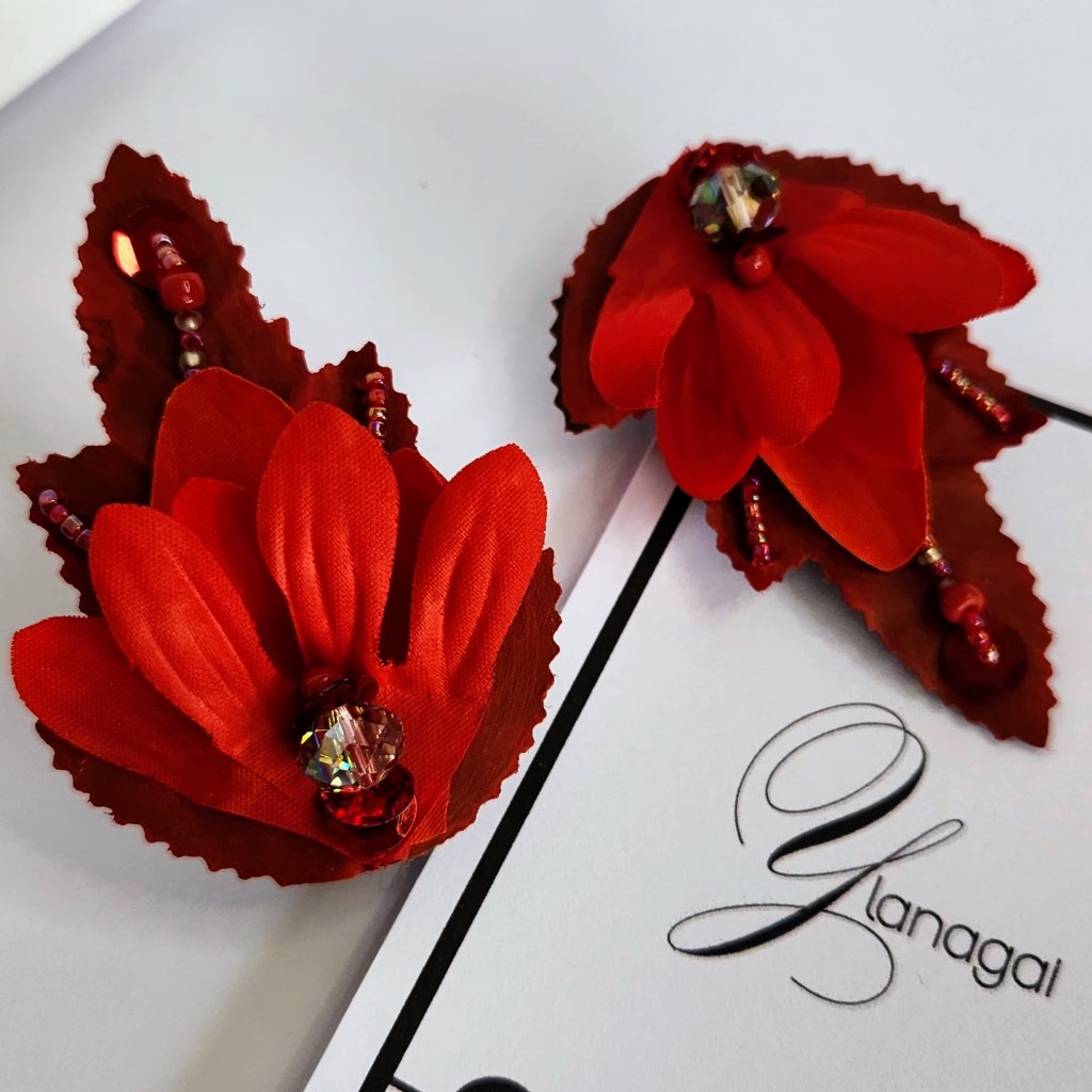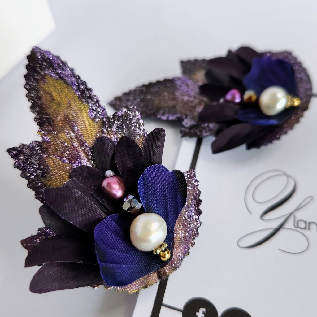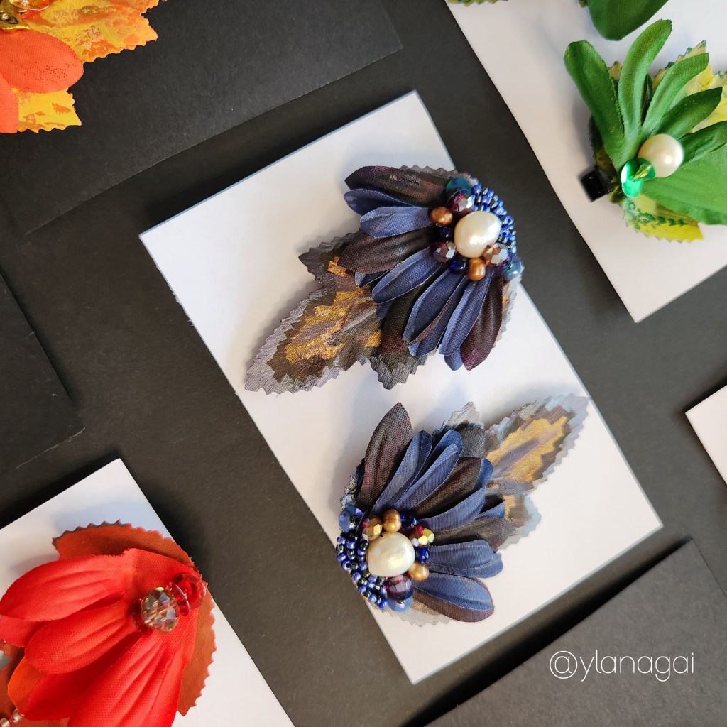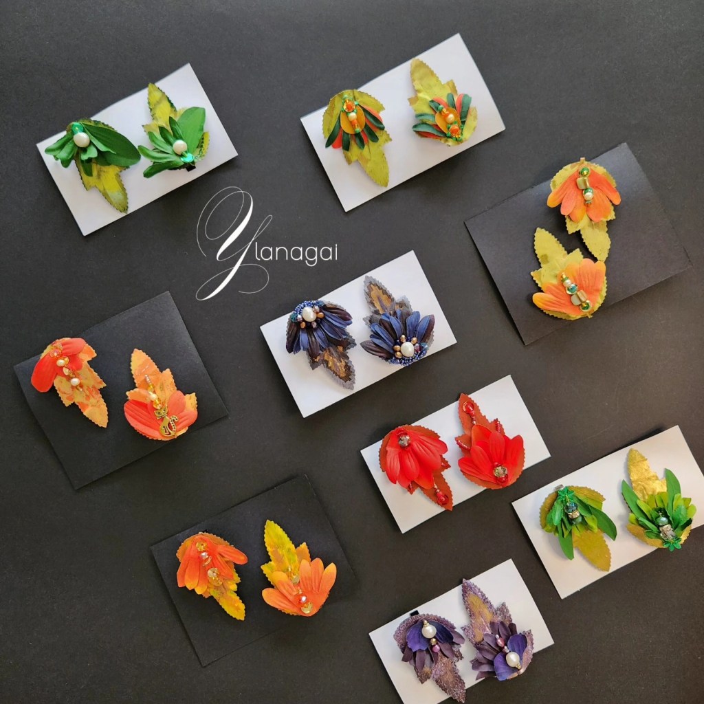 Accesorios para el cabello montados en clips de 2 pulgadas, confeccionados a mano con hojas y pétalos de flores artificiales previamente pintadas con pintura de tela y acrílica portando un diseños único e irrepetible.