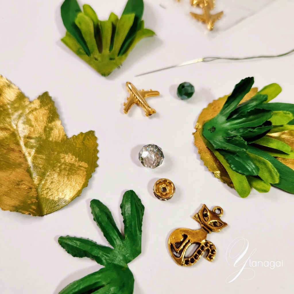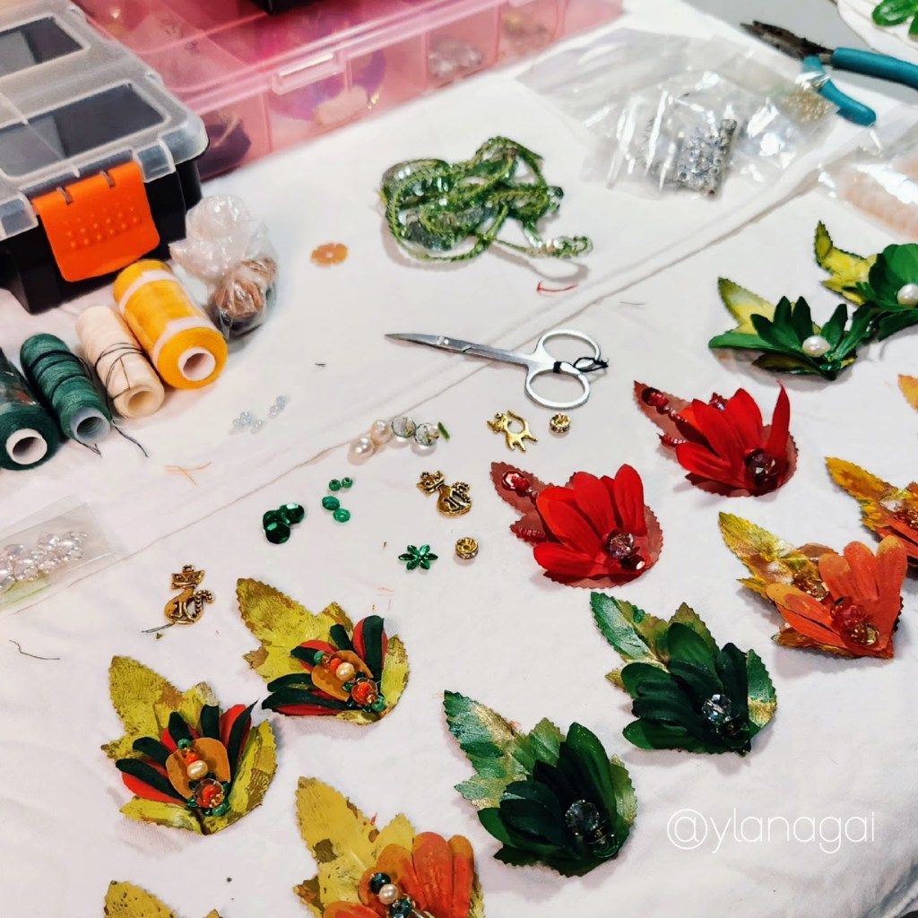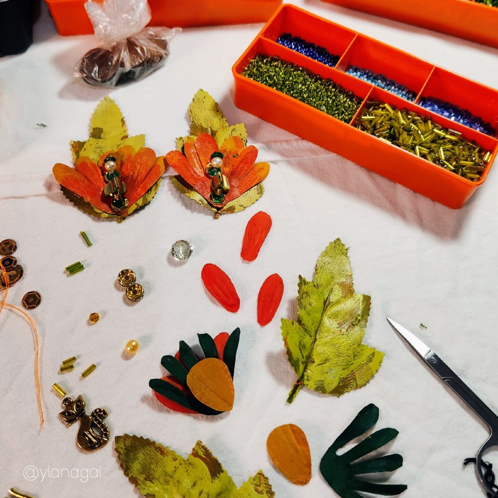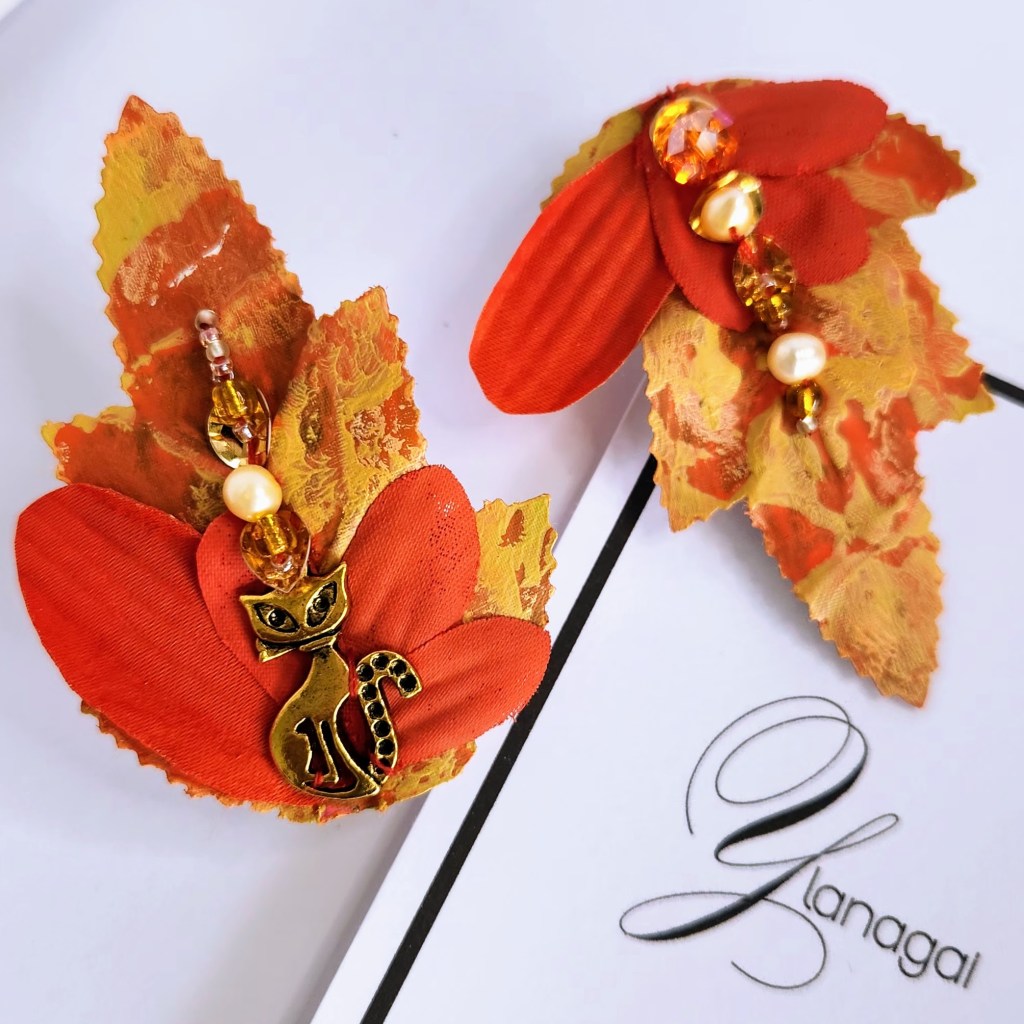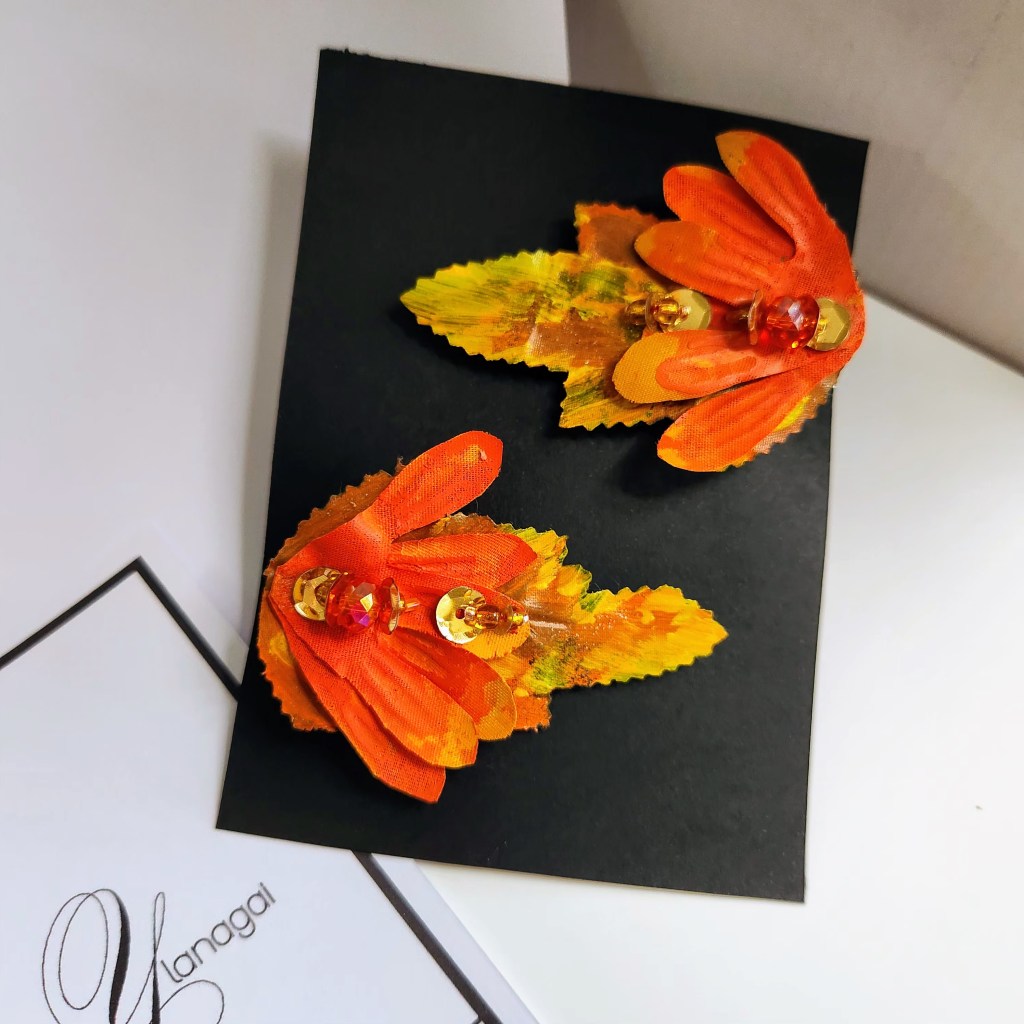 Accesorios para el cabello montados en clips de 2 pulgadas, confeccionados a mano con hojas y pétalos de flores artificiales previamente pintadas con pintura de tela y acrílica portando un diseños único e irrepetible.